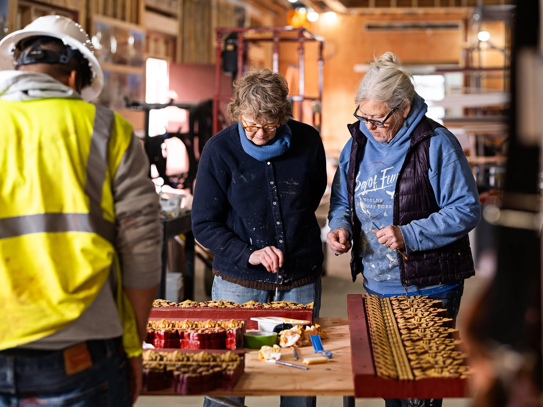 The team has set aside space to finish ornamental roof-edge components before installation. Fascia elements are laid out so painters can work efficiently and maintain consistency across the set.