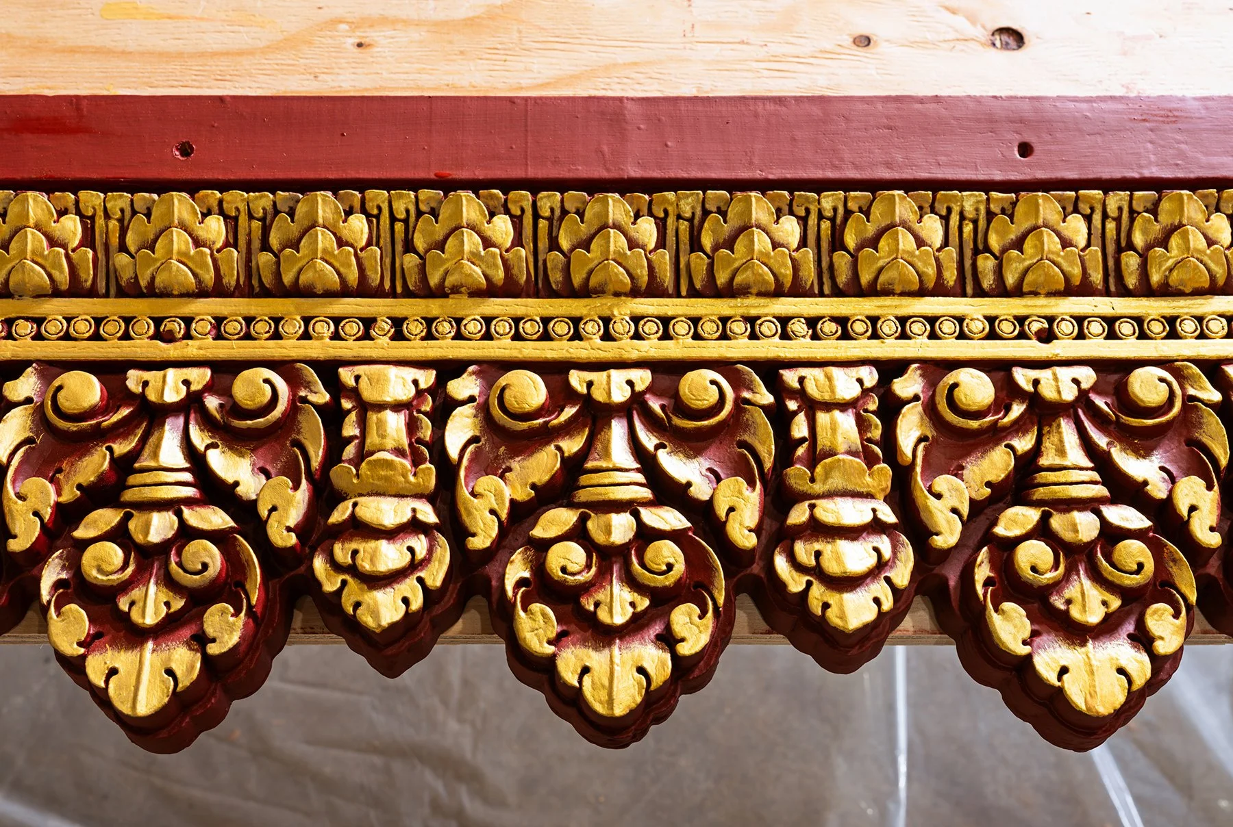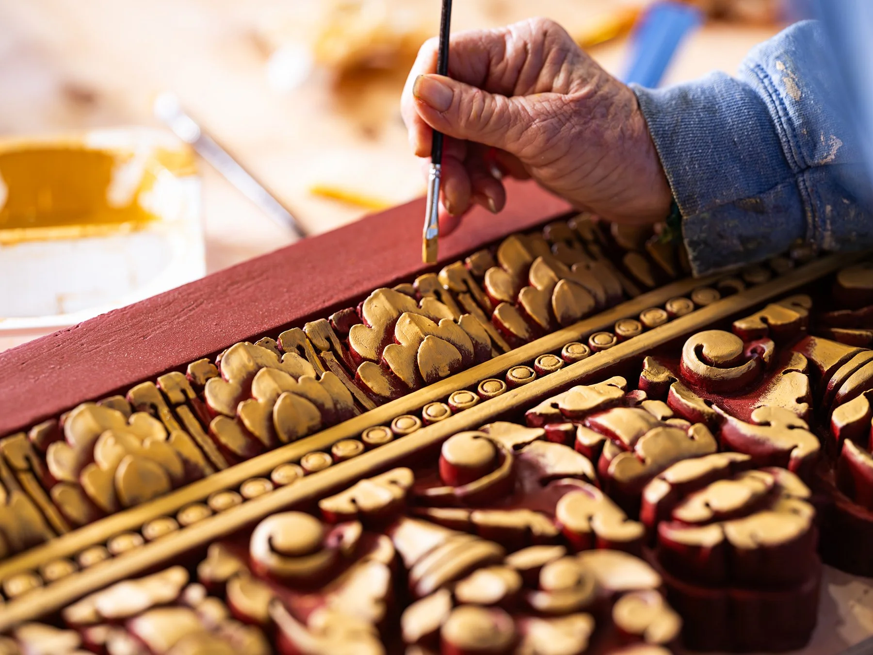 The process begins with a red base coat that establishes the field color. Gold accents are then built up in layers, moving from an initial pass to a brighter metallic finish. Rather than covering the entire piece in gold, the painters leave areas of red exposed. That contrast helps the carved forms read clearly from the ground.